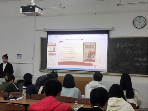 比赛现场,参赛选手们围绕主题,用生动的语言、真挚的感情,讲述了边防战士戍守边疆,建设国防的英勇事迹。其中,彭丹同学激动地宣誓:“我爱我的国,我爱我的家,我爱我的国家,国防在我心中!”一首《我和我的祖国》响起,先烈们誓死守卫鸭绿江,浴血奋战,捍卫领土完整的景象仿佛就在眼前。选手们缅怀了先烈们的英勇事迹,更结合了当代时局,领悟到“身处和平环境中的青年应该意识到,让人民远离战争的是祖辈们居安思危的忧患意识,以及永不止步的国防建设,而这样的重担终将由我辈青年接过。”的思想。
