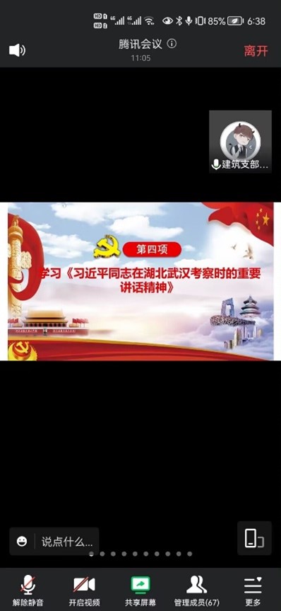 本次党日活动围绕七项内容展开。第一项,全体起立,奏唱国歌《义勇军进行曲》。第二项,全体学生党员温习入党誓词。第三项,学习并诵读《中国共产党章程》,加深对党的认识,强调政治信仰。第四项,黎恒同志在学习中央编印的《习近平同志在湖北武汉考察时的重要讲话精神》发言中提到,我们在日常生活中要把思想和行动统一到习近平总书记重要讲话和中央政治局常委会会议精神上来,深刻认识疫情防控的严峻形势,把人民生命安全和健康放在第一位,主动作为、特事特办,把疫情防控作为当前最重要的工作来抓,采取更果断、更有力有序、更科学周密举措,有效遏制疫情蔓延。第五项,由郑渊桐同志带领大家集中学习党课。第六项,各支部依次交流发言。杜雪、仲明明、李必扬在发言中围绕“共同缔造强治理,感恩奋进新征程”谈论到以思想自觉引领行动自觉,当好舆论宣传的守门人、当好新闻宣传的排头兵。要把学习省第十二次党代会精神与当前宣传工作以及“下基层察民情解民忧暖民心”实践活动紧密结合起来,感恩奋进新征程。第七项,各支部围绕“共同缔造强治理,感恩奋进新征程”进行讨论。